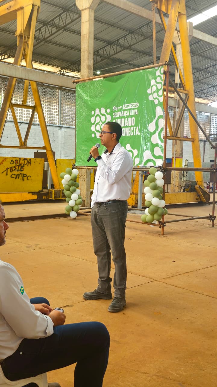 Os gerentes Eduardo Fernandes e Sillas Alves também discursaram. Eduardo ressaltou o compromisso da CMPC em se tornar cada vez mais segura, especialmente em suas próprias instalações, destacando a relevância da SIPAT para fortalecer a cultura de segurança nos contratos. Já Sillas Alves enfatizou sua participação na construção da programação, agradeceu ao setor de SSMA pela iniciativa e ao engajamento de toda a equipe para tornar o evento realidade, desejando uma excelente semana a todos.