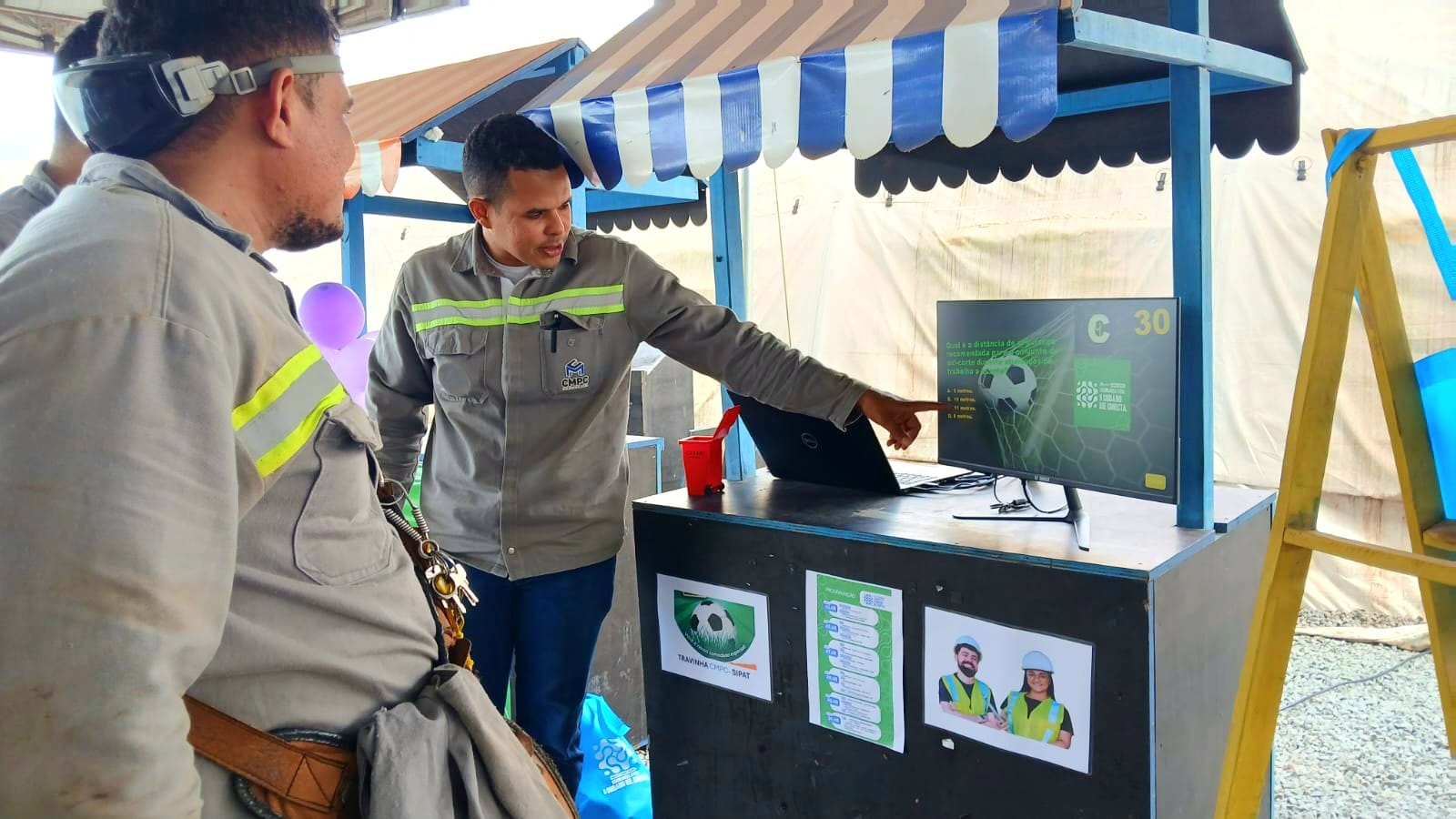 Durante a programação, tivemos no primeiro dia um quiz dinâmico de perguntas e respostas sobre saúde, meio ambiente e segurança, com o propósito de fortalecer o conhecimento da equipe de forma leve e participativa. A dinâmica foi realizada na área de vivência do restaurante central da Alumar. De forma lúdica foi aplicado um quiz junto aos colaboradores que estavam saindo do restaurante, utilizando travinhas e a entrega de brindes, incentivando ainda mais a interação de todos.